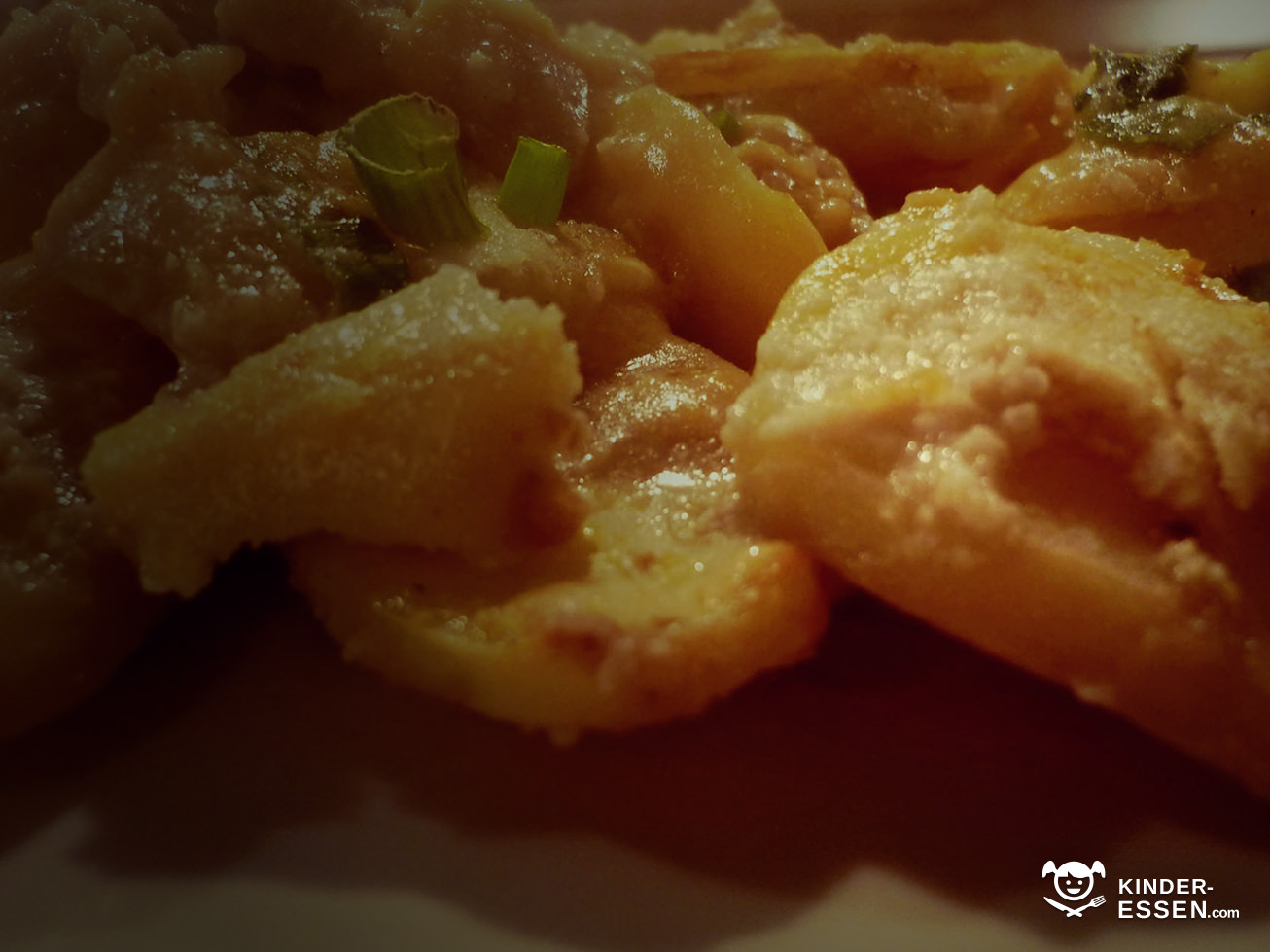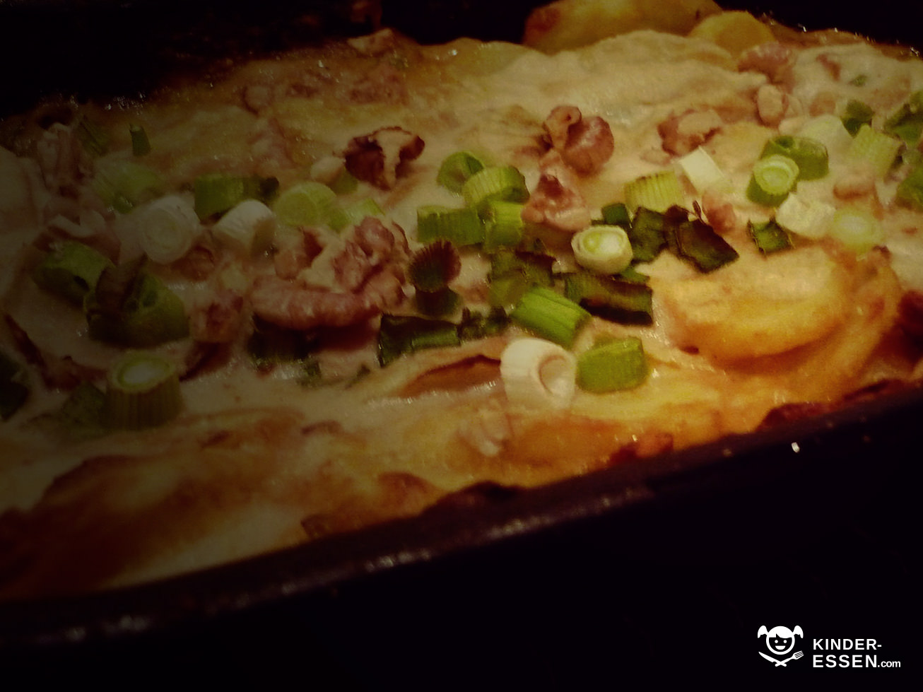 Nun die Kartoffeln in eine Auflaufform schichten. Zwischendurch etwas Babyspeck hinzugeben. Sahne mit der Milch mischen und auf die Kartoffeln geben, so dass diese fast bedeckt sind.